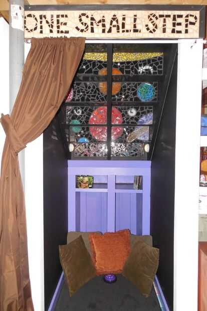 Ponemos cojines de rompecabezas de los niños debajo de la alfombra para que sea más confortable. Éstos vinieron de una tienda, y la alfombra era de una tienda de descuento. Era de ventas de yarda o tiendas de segunda mano así como la caja de almuerzo de Star Wars! Hemos añadido luces de empuje, y a ser dejar nuestras hijas decorar con brillo en las estrellas de la oscuridad a medida que envejecen. Por último, nos gusta juego de palabras y el mensaje: "Un pequeño paso" de Neil Armstrong desde es espacio después de todo, pero también es literalmente un espacio debajo de escaleras y "Al infinito y más allá de" via Buzz Lightyear para nuestro lado caprichosa y soñadora! El mensaje junto, "Un pequeño paso al infinito y más allá" nos recuerda que nosotros controlamos nuestro futuro pero pueden tomar en cualquier dirección... sobre todo a través del poder de la lectura, pero que es la profesora de inglés en mí!