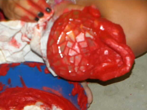 Después la lechada durante unos minutos, puede empezar a limpiar el cráneo. Esto se hace mejor con un papertowel húmedo o una esponja. Asegúrese de que su húmedo y no mojado. suavemente Limpie la boquilla, brille tu pieza y disfrutar!