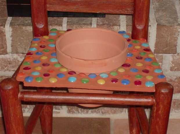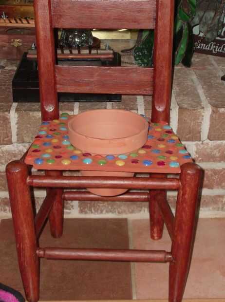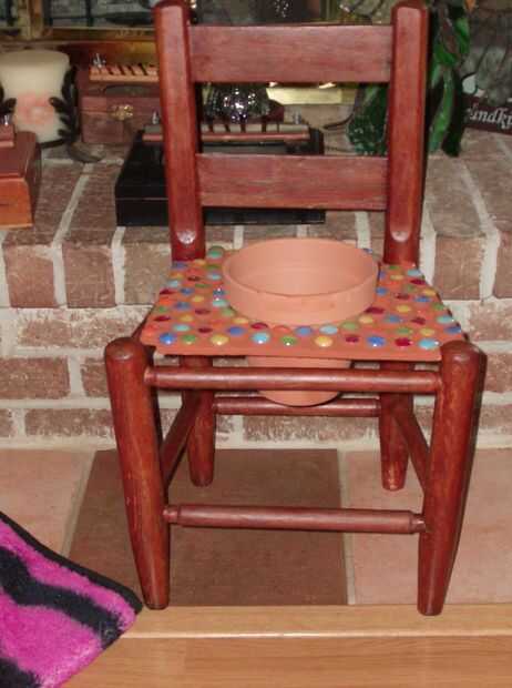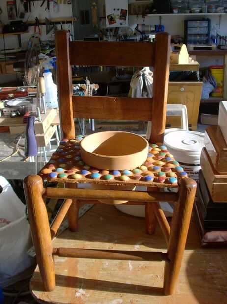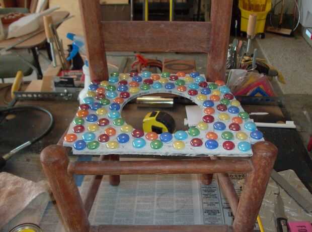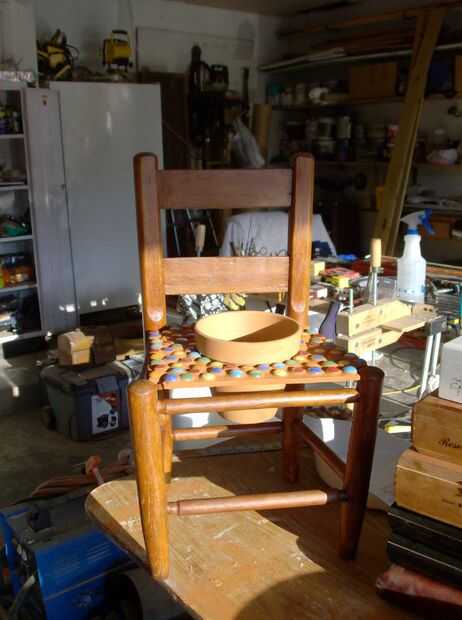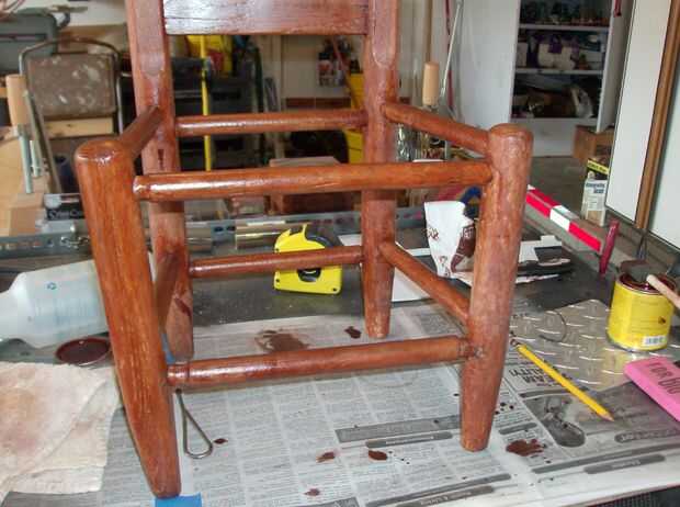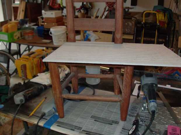 Es viejo tranquilo así que dio una nueva capa de mancha y de poliuretano para darle una mirada fresca. Entonces, tomó un trozo de Junta de mortero y había colocado encima de la superficie del asiento de la silla y marcado que necesitaba para hacer muescas a la parte de atrás. Muescas en esta salida con una herramienta de disco de corte de Dremmel.