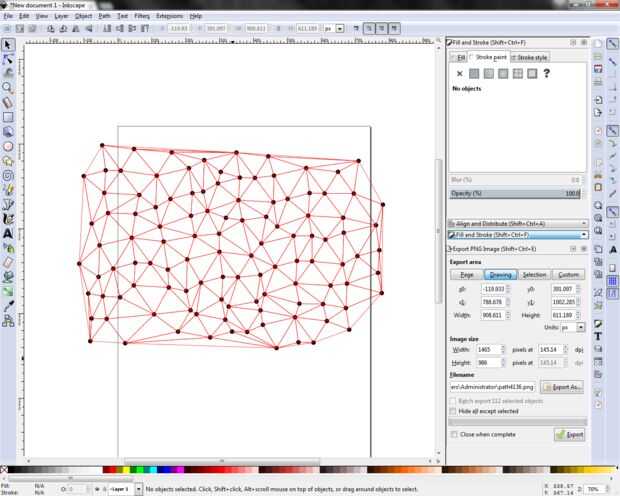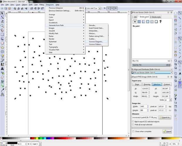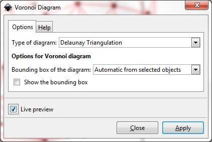 Seleccione la matriz completa de nodos que usted dibujó en el paso pasado. Con todo seleccionado, abra la herramienta de diagrama de Voronoi por ir a extensiones > generar ruta > diagrama de Voronoi.