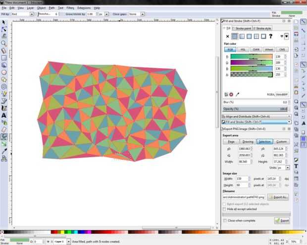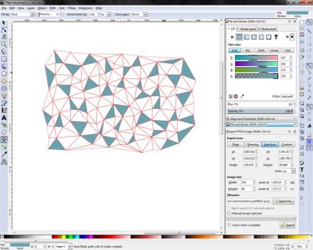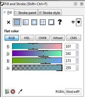 Pro-TIP: Usar la entrada color hex ("RGBA:" cuadro en la parte inferior derecha del menú relleno o trazo) para especificar los colores de relleno en lugar de al RGB cajas (o CMYK, o lo que usas). El código de color hexadecimal es una sola cadena alfanumérica de seis dígitos por lo que sólo tienes que copiar/pegarlo una vez en lugar de 3 - 4 veces. En Inkscape, verá ocho dígitos en el cuadro de entrada. Los 2 últimos son el valor del canal alfa (transparencia). Dejarlos en conjunto como "completa" = 255 = "ff" :) código es divertido.