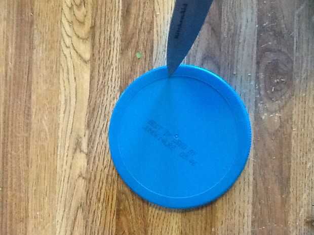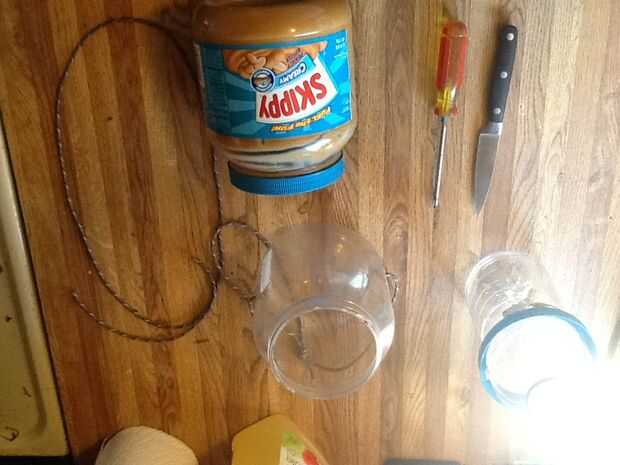 Primero limpia todo, luego hizo mis cortes. La tapa del tarro de mantequilla de maní tiene un labio en el exterior, corte derecho contra él y él te dará un círculo suave agradable.  Como estuve cortando esto estaba calentando mi destornillador pequeño sobre la estufa. Se utiliza para perforar dos agujeros en la parte inferior de la jarra de PB, luego cada extremo de la cuerda 550 a través de la cadena y nudo cada uno.  Cortar unas ranuras en lo auxilios de alimentación botella abot 1-2 pulgadas de largo horizontalmente y aproximadamente 1/4 de pulgada de ancho (esto es donde las moscas check-in).