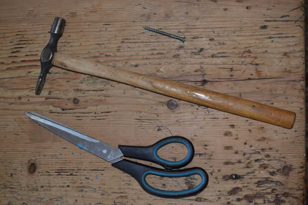 Tijeras, martillo y un tornillo. Las tijeras son la manera más segura para cortar la botella. Por favor no use un cuchillo! Es probable que cortarse ya que es un material sorprendentemente difícil cortar con seguridad y no conseguir un corte limpio de todos modos!. El martillo y el tornillo es simplemente para hacer agujeros para la cadena. Tal vez usted puede improvisar. Otra vez, no utilice un cuchillo!