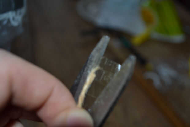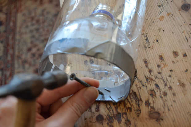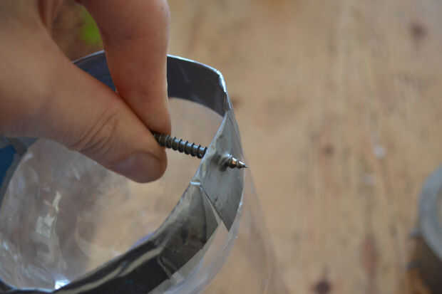 Hacer los agujeros para la cadena. La manera más segura creo que pude hacerlo fue un martillo y un tornillo. Quiere para que ambas capas del plástico (es decir la base y el pico de bits) se pinchan con el mismo agujero - esto hará que la cadena apoya la parte superior e inferior simultáneamente agregando 50% más fuerza (cinta + cadena = 100%!). Una vez que usted está a través de usted puede manualmente del hilo de rosca el tornillo más para ampliar el orificio.
