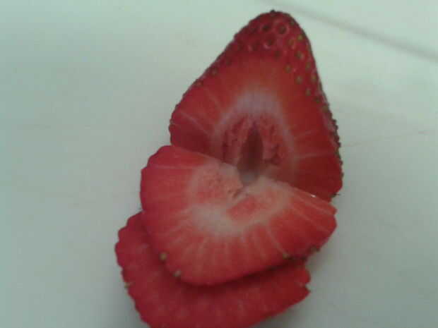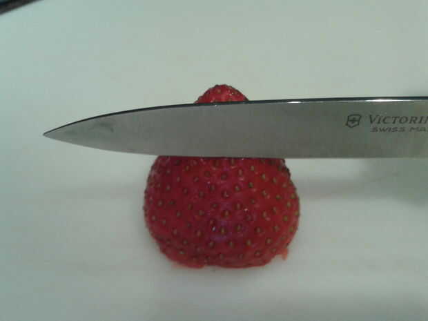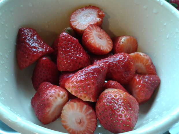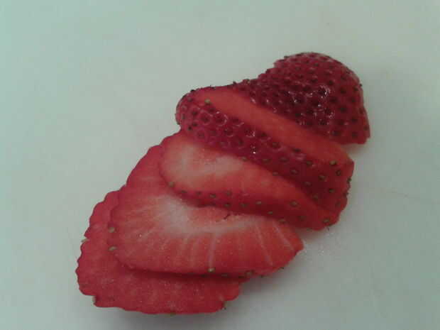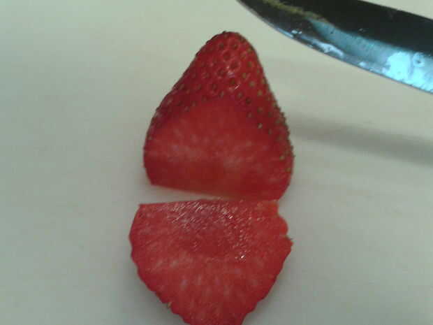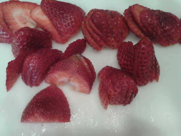 3. Lave la fruta y con sus fresas, corte la parte del tallo-hoja y coloque sobre su ' blanco parte (o parte de madre). Luego corte en rodajas horizontales delgadas y medianas. Después de listo con todos ellos, ponerlos en la nevera.