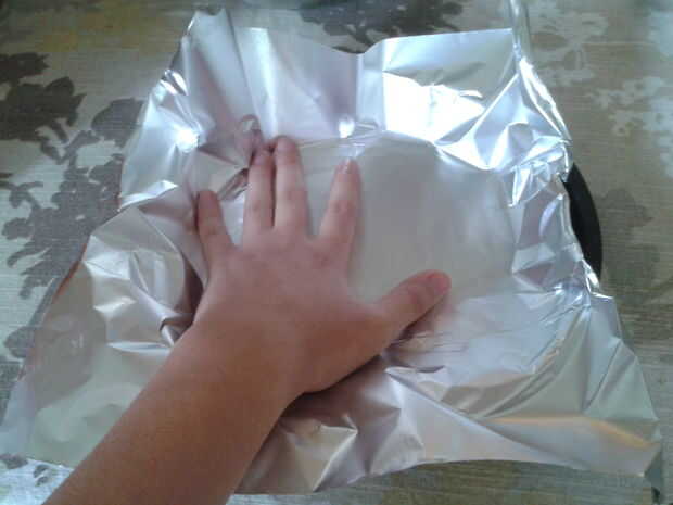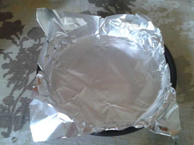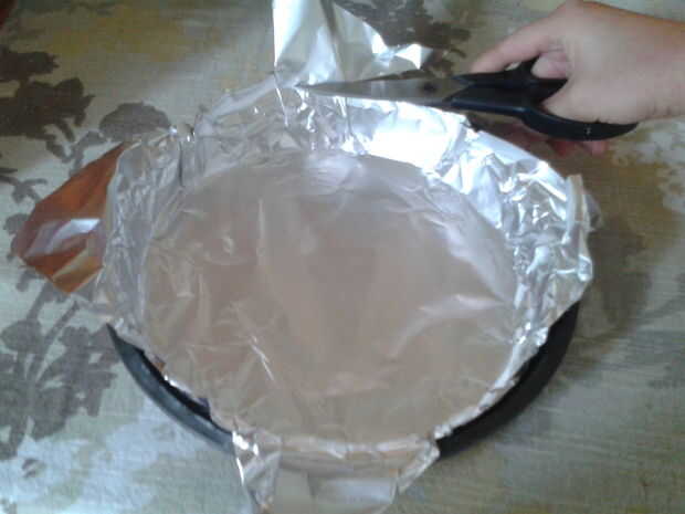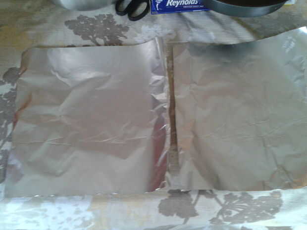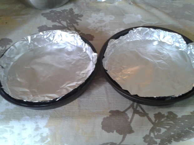 1. rasgar dos hojas grandes de papel de aluminio que serán capaces de cubrir la longitud y la anchura de tus moldes. Luego presione un papel de aluminio en dos moldes para que cubra la mayor parte de los bordes de la parte inferior (confía en mí, no mantequilla tu pastel sartenes ya que será un poco **... perdón un "poco" de trabajo para sacar tu pastel de sus cacerolas). A continuación coge tus tijeras y recortar todo el exceso de aluminio que está pegando en la parte superior o en su bandeja (tan larga como su cubriendo la parte inferior de la mitad de su pan... tu bien).