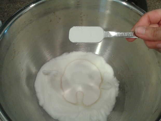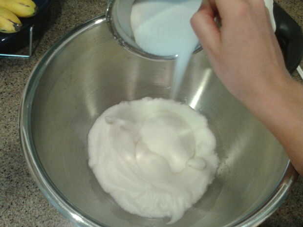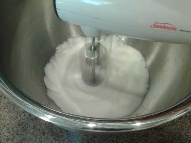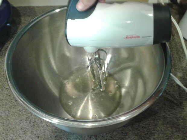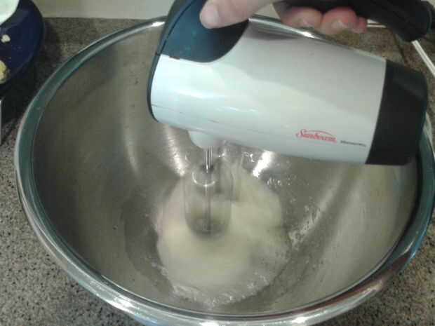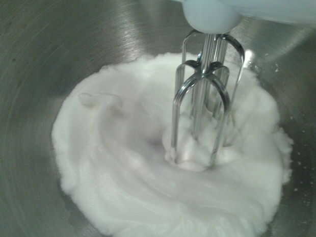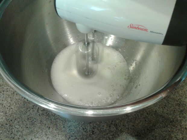 2. batir sus claras de huevo con su batidora de mano en medio-alto hasta que formen picos suaves (5-7 min.).