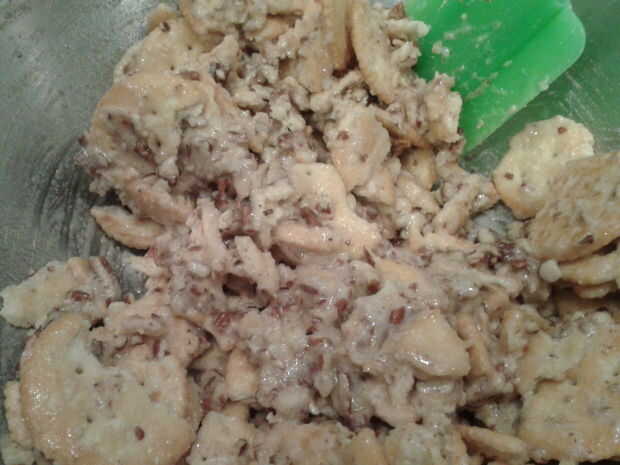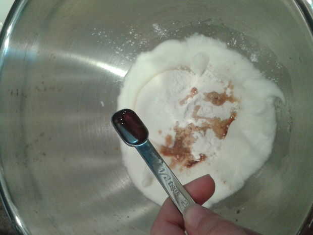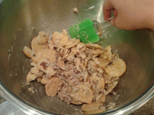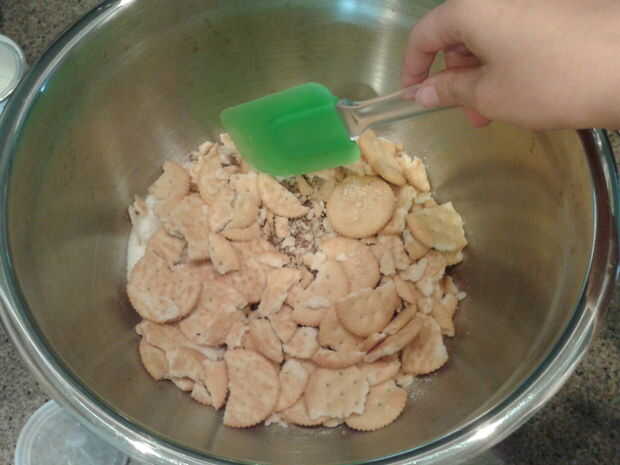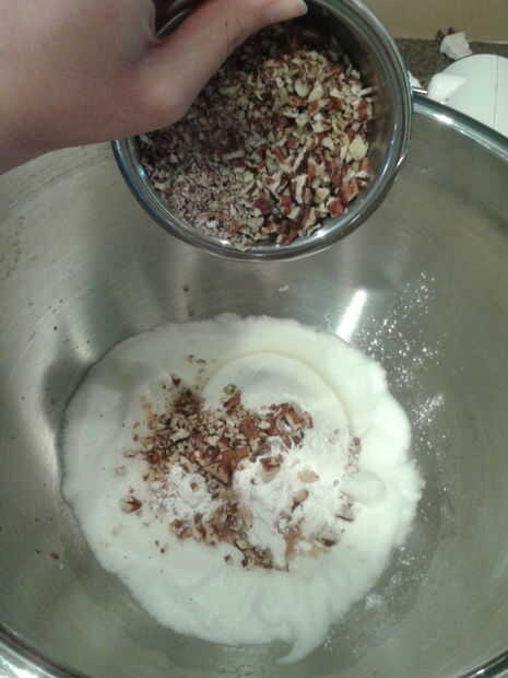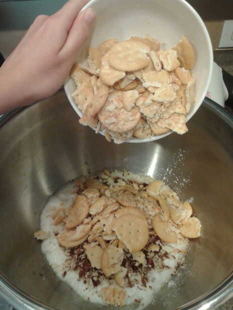 3. Mezcle el azúcar, polvo de hornear, extracto de vainilla, las nueces picadas y galletas en su huevo. (Asegúrese de que usted cubrir sus galletas con las claras de huevo).