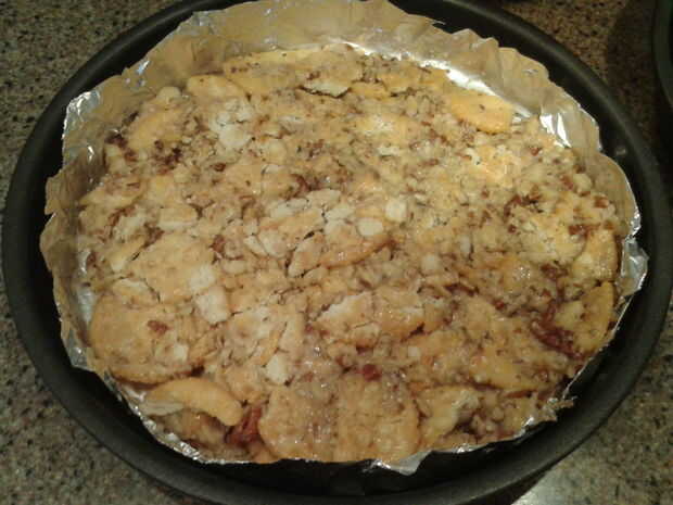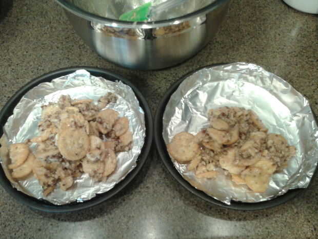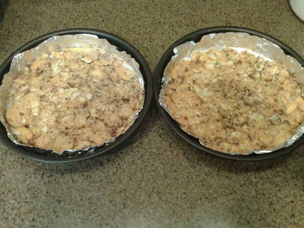 4. a continuación, dividir la mezcla en dos y vierta la mitad de la mezcla en un pastel y verter el resto en el otro. Esparcir la mezcla de lo mejor que puede y cubrir el fondo. (Se parece como que no tienes suficiente mezcla para cubrir el fondo pero que funciona, solo tienes que a difundirlo y que tendrás que aplastar algunas de las galletas para que se ajuste mejor... tu pastel se ven como una hoja muy fina).