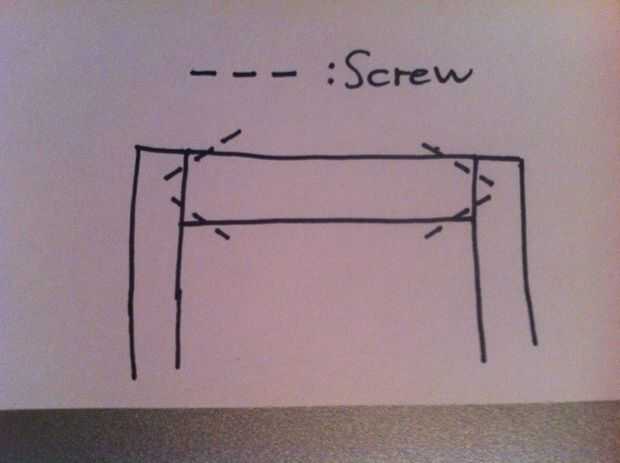 Diseño de los lados, puedes ver he añadido un apoyo un pie abajo de la tierra. Pretaladrar los agujeros y tirar abajo algun pegamento para estas juntas de culata (teehee). Si quieres más fuerza, lanzar algunos aserrín sobre el pegamento (¡ Bam!) y mezclarlos juntos, usted pensará es concreto, te lo juro. de todas formas una vez lo tienes pegado, atornillar las piezas, he usado tornillos de 3", dependiendo del tamaño del tornillo podría lanzar en dos en vez de uno. Para las piezas que unen los lados, poner un tornillo en la parte superior e inferior en diagonales (ver diagrama profesional).
