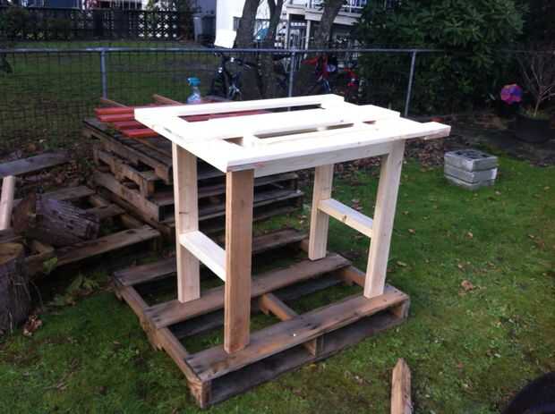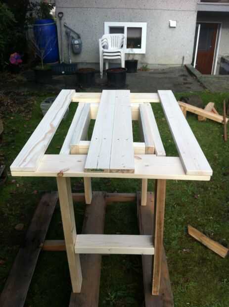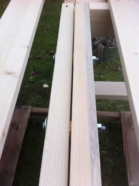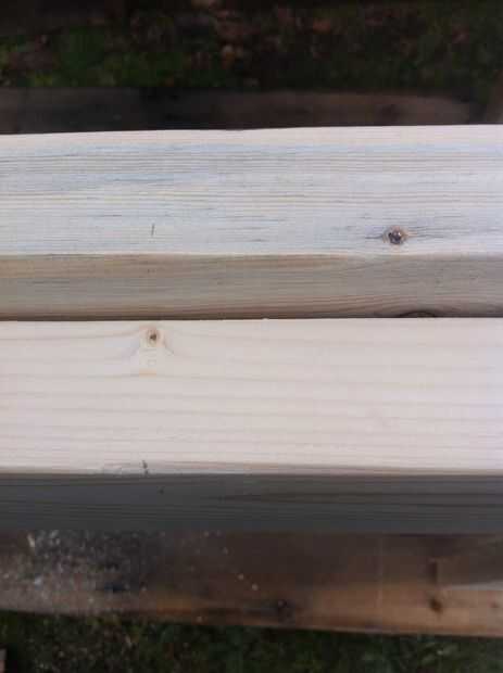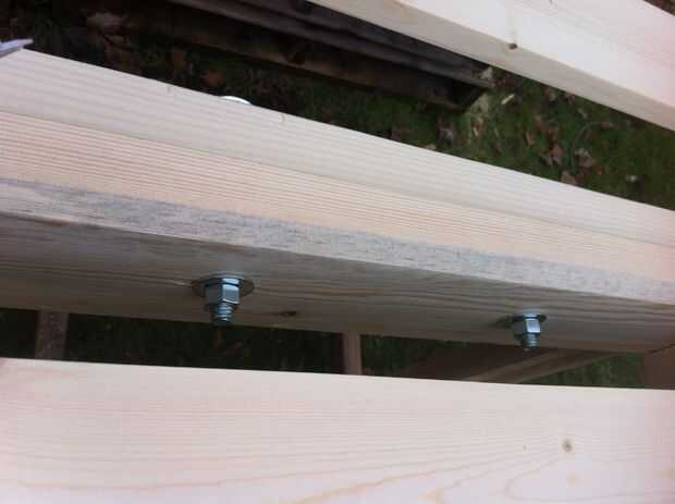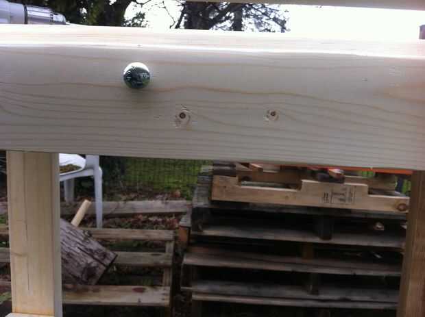 Así que si no estás haciendo una mancha de dos tonos, tiene una tabla completa ahora... o es! Encontrar los puntos medios de cada caja (longitudinalmente) y hasta. Luego, en los frentes de las piezas largo, mida sobre 3.5"-4" de ese punto y marcar los agujeros para los pernos. Utilicé un 3/8" bit y solo se mordió, después fui al frente de cada orificio con una 1/2" broca para los pernos se sentaban mejor. Comience de tinción, si no estás manchas uso una capa transparente. Si vas a compilar esto con palets... paletas son sucios, por lo que necesita sobre todo una capa transparente.