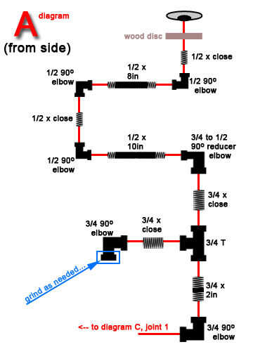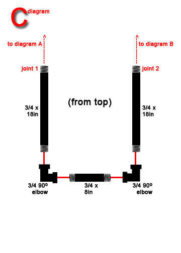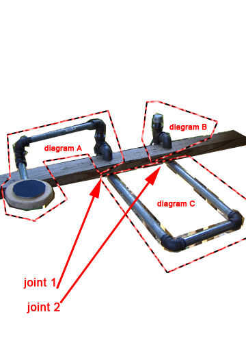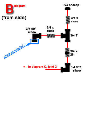 He hecho tres diagramas de piezas que muestran cómo todas las tuberías de componentes encajan a las diferentes áreas de todo el asunto. En la siguiente imagen puedes ver cómo todos ellos están orientados. Utilizar las imágenes adicionales, que están marcadas por su letra correspondiente del diagrama, para ver lo que hace que esa área.