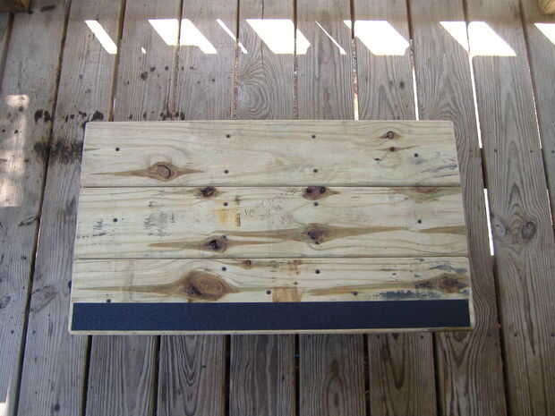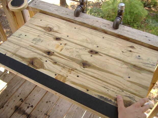 Para el pie de página, yo quería algo lo suficientemente pesado para actuar como un lastre y pesan la mitad de la encimera, además de caer profundidad suficiente a través del soporte de tubo para provocar que sea difícil de volcar la encimera si peso aplicó irregularmente. Elegí chatarra tratada segmentos de 2 x 6 para los pies (señalado en la imagen como A y B). Estas eran muy pesadas para su tamaño. Hay un pedazo corto de 2 x 4 tratada (señalado en la imagen c) entre los dos para ayudar a conectar y mantener distancia distancia que es importante ya que tienen a deslizarse por entre las barras de soporte de la tubería.