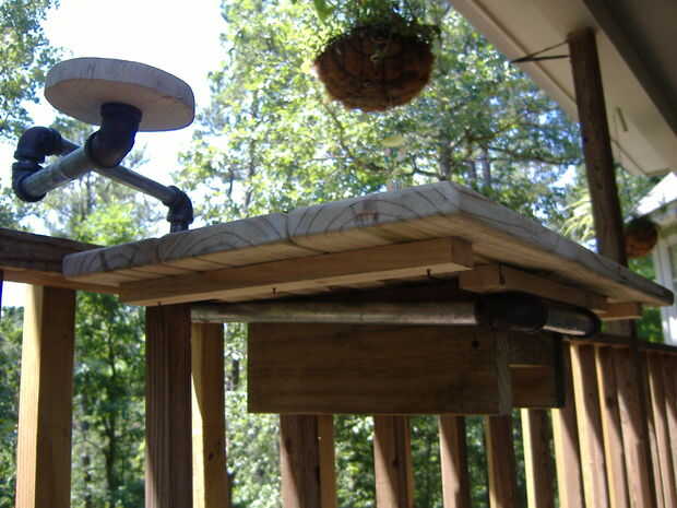 Tengo una pieza de 1 x 2 (realidad. 75x1.5 creo) tope contra el extremo de la 2x6s (señalado en imagen g). Esta pieza se encuentra en la parte superior los 3/4 x 8 pulgadas pedazo de Cruz pipa (mejor vista en la cuarta imagen) y es necesaria nivelar la encimera, como el soporte de la tubería por él es diseño pendientes hacia abajo hacia el frente.