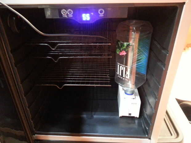 Finalmente, llenar la botella con agua (filtrado, o en nuestro caso, agua destilada ya que contamos con nuestro propio destilador de agua de uso) y coloque el humidificador. Gire el control del humidificador completamente. Asegúrese de sus cuerdas a través de la puerta (incluido el sensor de temperatura y humedad) de la ruta. También colocamos el refrigerador en una bandeja de arranque que tenía por ahí para atrapar cualquier derrame, fácilmente puede utilizar una bandeja de plato. El punto es, agua va a ser de condensación en el interior de la nevera y drenaje hacia fuera de la parte inferior. Usted puede confiar en la bandeja de goteo estándar montado muy pequeño, muy posterior (que fácilmente se desbordará en una noche) o poner algo debajo de la unidad que puede manejar un poco más de agua y ofrecer seguridad al fregadero.