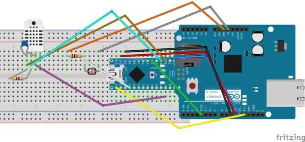 Como se puede ver en el gráfico de arriba, también hay resistencias pull-up adicional y un condensador. Conecte los 4, 7kΩ resistencia entre la tierra y los datos de la DHT11. El condensador de 100nF entre VCC y GND de la DHT11. La última parte – una resistencia 10kΩ – debe colocarse como un resistor de pull-up para el fotoresistor desde el pin de datos a la tierra (en Ethernet Shield en mi caso)