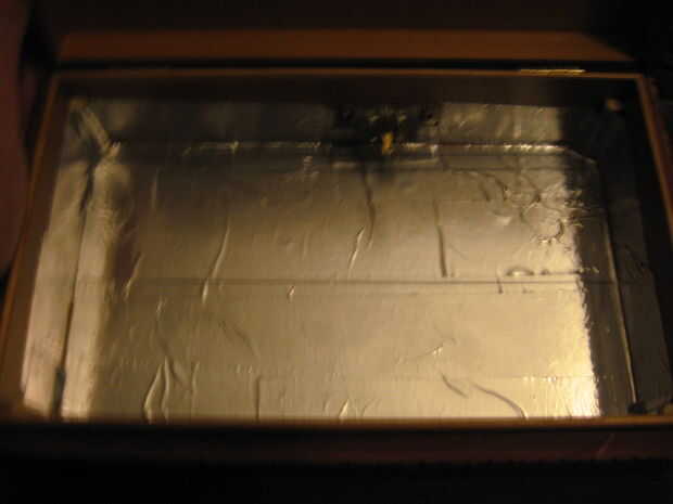 Una vez que el pegamento tenga cubierta seca el interior de la caja con la cinta de la reparación de ductos metálicos. Esto le ayudará a reflejar la luz. Sólo comentar la longitud y utiliza tijeras para cortar la cinta, asegúrese de mantener la cinta por debajo del nivel de las ayudas para que la cinta no será visible cuando el cuadro está terminado.