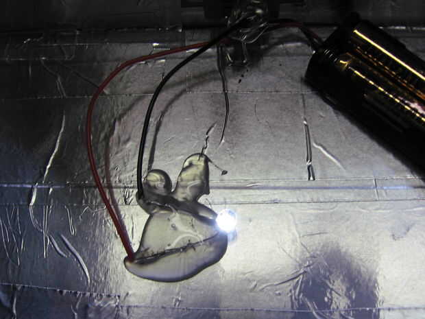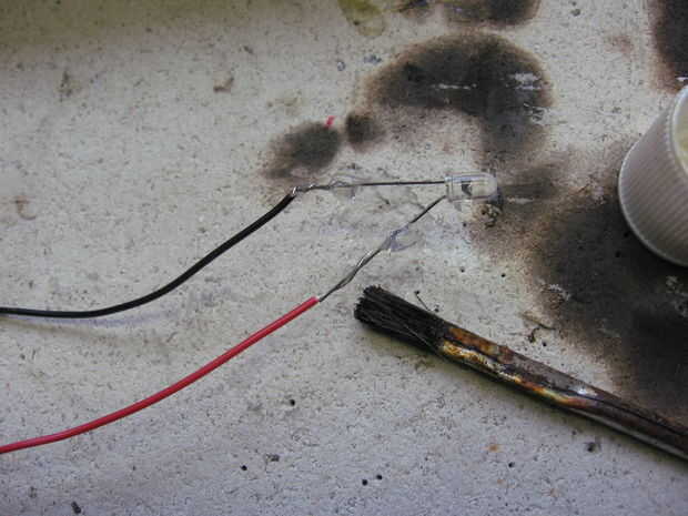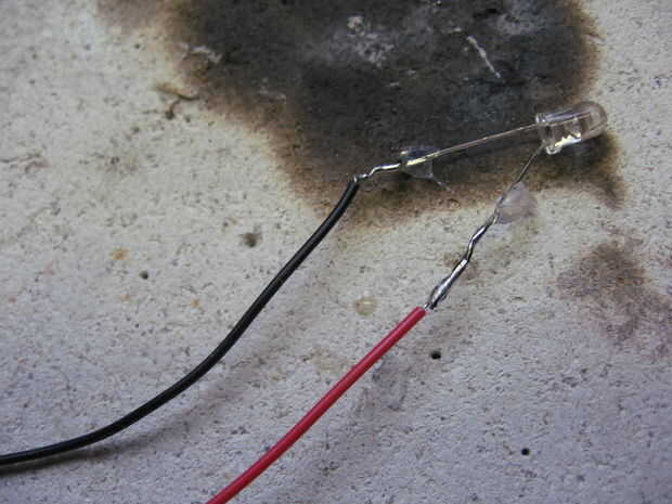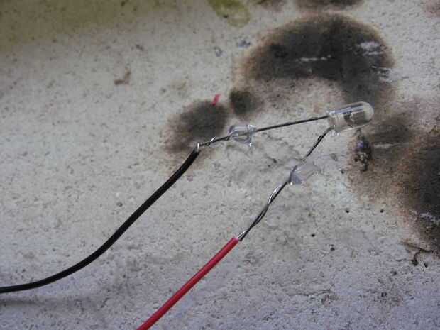 Soy una muy pobre en soldadura y no hacerlo a menudo así que no tengo pinzas o ayuda manos mintiendo acerca de la plataforma. Para mantener los cables en su lugar en el LED envuelve los cables alrededor del apropiada conduce (positivo con positivo, negativo con negativo) y luego utiliza una gota de pegamento caliente para mantener en su lugar. Una vez que haya enfriado el pegamento me aplica flux y luego Soldamos las conexiones.