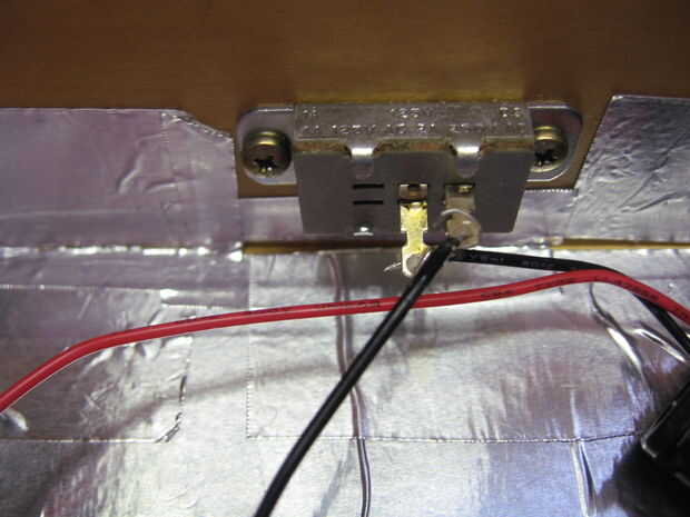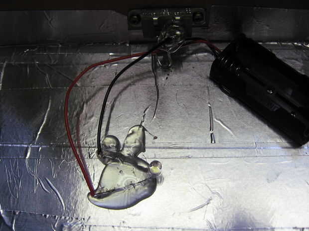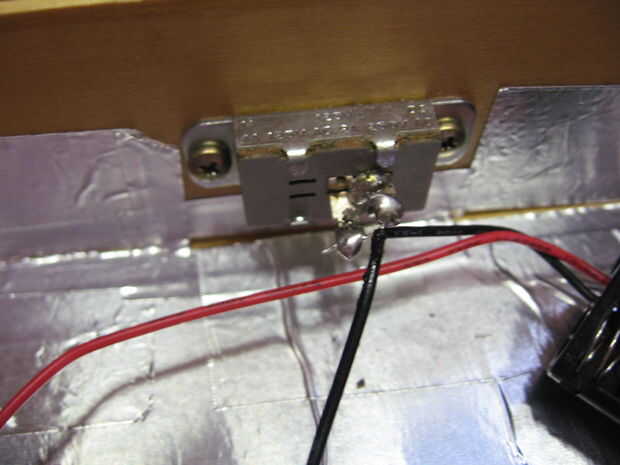 A continuación caliente pegar el portapilas cerca del interruptor (sin las baterías en él) y luego soldar el cable de negativo de lo LED y el cable negativo en el soporte de la batería a las conexiones del interruptor. He seguido el proceso que suelda arriba excepto no utilizar pegamento caliente para mantener los cables en su lugar. Las conexiones del tenían pequeños agujeros en los que usé para envolver los cables alrededor de las conexiones para sostenerlas en lugar.
