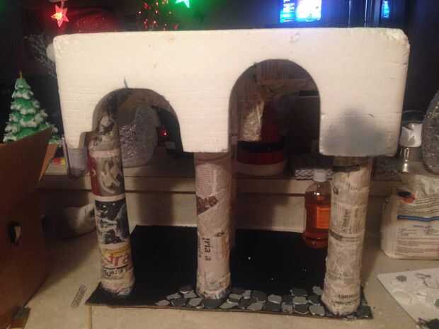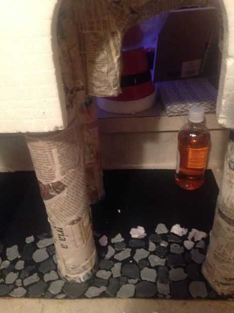 Empezar por conseguir un pedazo de cartón como el de la coca-cola que se comprar en cualquier supermercado, corte para caber la parte hecha con anterioridad, pintura negra o cualquier color que te gusta y empezar a tallar trozos pequeños de otro pedazo de espuma de poliestireno, cortar pequeños trozos irregulares w su cuchillo, tallado toneladas de ellos algunos más grande los otros y algunos de otro tipo de espuma que encontré , recuerde para mezclarse y el fósforo, diferentes poliestireno dará diferentes texturas y una ligera variación de color, sensación y aspecto. Ahora usar tu pistola de pegamento para adherir las piezas de espuma, es donde se pone un poco complicado, por eso pregunto porque usé un mechero derretir algunos de lo exceso de la espuma de poliestireno, impresionante impresionante mirada que lo único es que hay que tener cuidado de este material se quema rápidamente. Muy rápidamente por lo que necesitará ser más atentos con esto (niños pídeles a tus padres ayuda en este caso) y los padres por favor ten cuidado cuando tu hacer este paso. Que tienes que hacer este paso rápidamente o se come toda la pieza de espuma de poliestireno tan fácil y rápido es el camino a seguir con este paso, ahora encontré un gris pálido y una negra que se esponja, le dio a un áspero, empedradas y mirada al piso