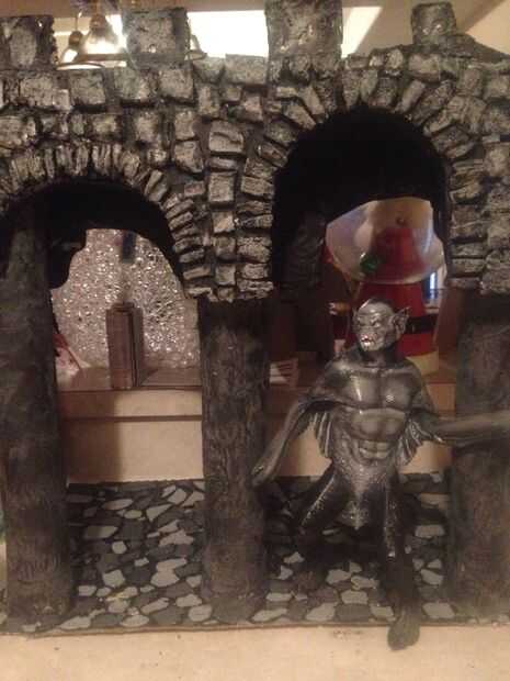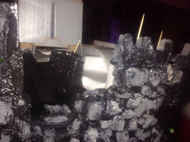 Ahora la parte superior del castillo es bonito todo fácil que hice fue cortar cuadrados de espuma de poliestireno más algunos grandes algunos pequeños, ponemos los cuadrados más grandes hacia la parte delantera y las pequeñas hacia la parte posterior y los lados, utilicé pegamento común para esto, luego me pintado gris y ellos esponja método w negro, también utiliza el encendedor , sólo básicamente quemando (algunos más que otros) les para dar más de una carrera hacia abajo de la mirada, en este momento empecé a notar que mi pantalla entera consistió en 2 colores que para mí fue un poco aburrido, así que me acordé tenía un poco bolsa de arbustos de un proyecto de pasado, que luego decidió utilizar esto para poner un toque de color y le daría un look un poco crecido en abandonados viejos , Fui un poco y ponga poco racimos de arbustos donde mi pantalla estaba buscando un poco menos que perfecto, lo hice a lo largo de toda la estructura.