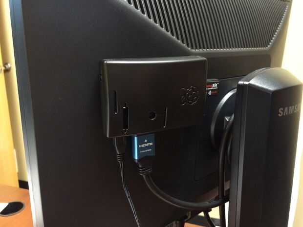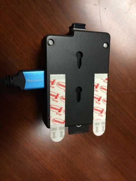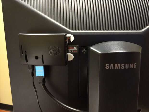 Asegúrese de que cuando te las tiras de comando de 3M en la parte posterior del Pi del caso que usted deje el extremo redondeado visible y accesible para cuando se une a la parte posterior del monitor. Usted tendrá que