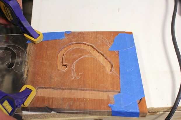 Utilice cinta de pintor para fijar el patrón de acrílico en la base por lo que se queda puesto y sujete todo el conjunto hasta la mesa de trabajo.
