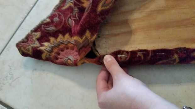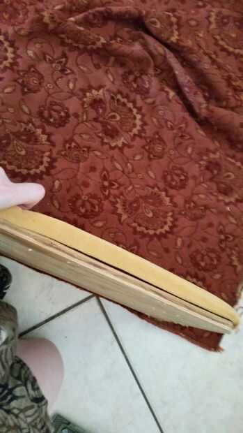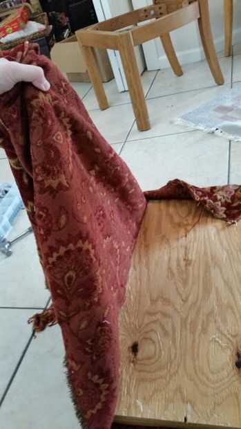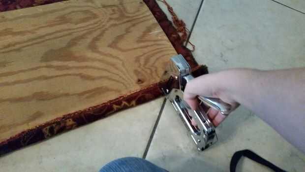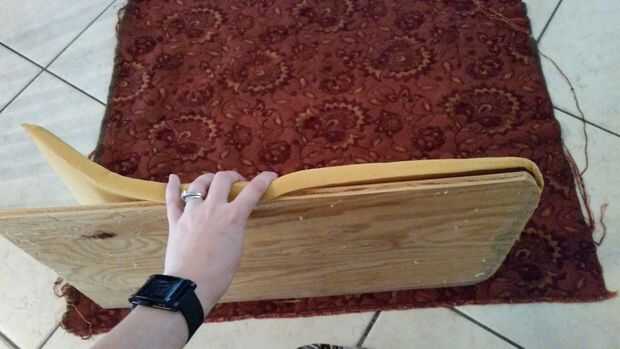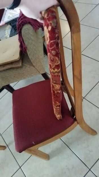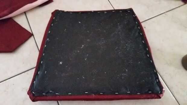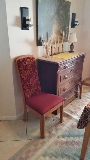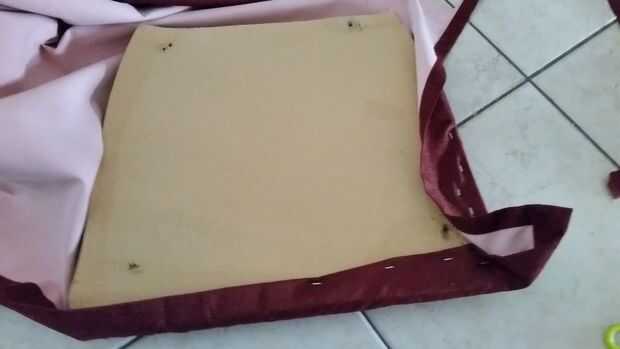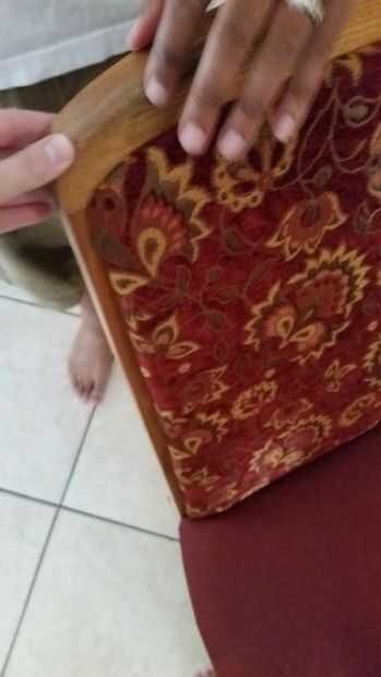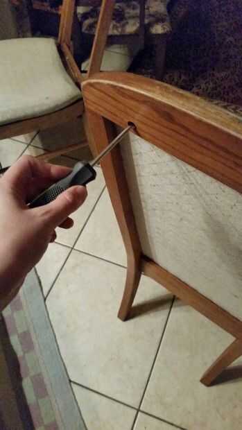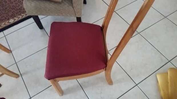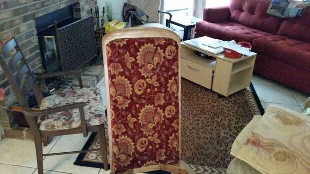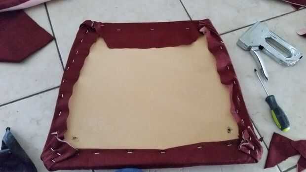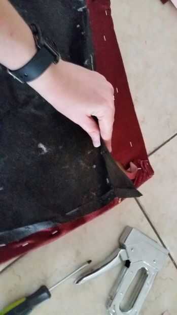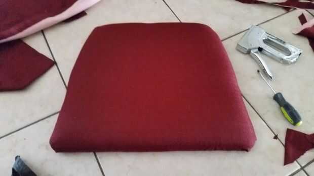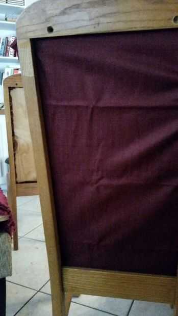 Needed more chairs and mother-in-law was deshacerse de algunos. Resumen: Desatornillar los amortiguadores, saque las grapas con tela, cuidado de preservar amortiguación debajo, asegúrese de que la tela se estira uniformemente y plana, de la grapa con la grapadora de tapicería (asegurándose de que las grapas no serán visibles), orden comprobación de piezas para atornillar detrás para que no hay arrugas en la tela. Bono: habían algunos trozos extras así que cosieron los en una pieza lo suficientemente grande como para recuperar una silla adicional. Asegúrese de que se estira completamente para reducir arrugas de patchwork.