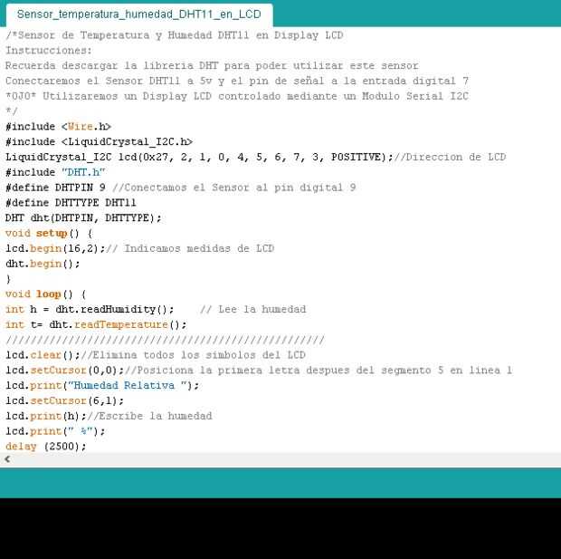 Copia y pega el siguiente código, recuerda descargar las librerías necesarias para utilizar el Modulo Serial I2C y el Sensor DHT11.
