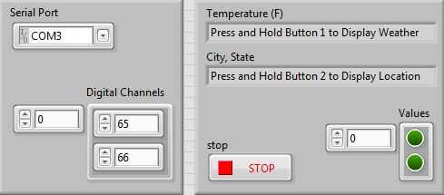 Ejecute el VI y presione y sostenga un botón para mostrar el tiempo actual o su ubicación actual.