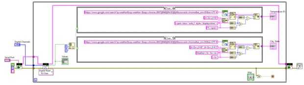 Este VI informes si son empujados con una salida de verdadero/falso y monitoriza canales digitales 65 y 66. Los valores se almacenan en una matriz para que el bloque de la matriz de índice se utiliza para llegar a cada canal individualmente y enviar el valor de verdadero o falso en una estructura de caso. Si se pulsa un botón, LabVIEW se va a la URL indicada conectada al bloque de conseguir HTTP. Entonces la función coincidir de expresión regular se utiliza para buscar una parte específica de la cadena que contiene la información deseada. Entonces esta cadena es procesada para que se omiten los caracteres adicionales en la cadena que se encuentra antes y después de la información real que desee.
