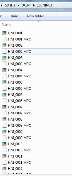 Cada cuadro tiro en su 3DS tiene un archivo JPG y un archivo MPO. Lo que quieres es el archivo MPO, contiene tanto la imagen izquierda y derecha mientras que el JPG sólo contiene uno. Así que copie los archivos MPO en el ordenador.