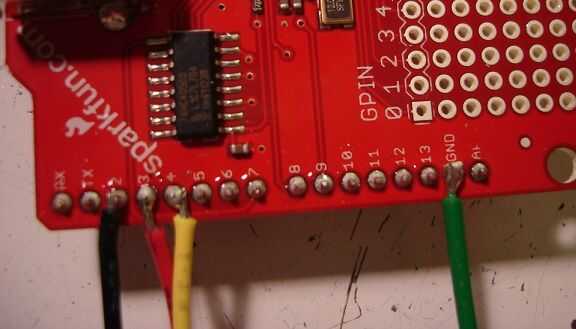 La soldadura de los cables de LED para el escudo de host como se muestra desde el escudo cubre las cabeceras hembra arduino donde los cables se utilización para ir.