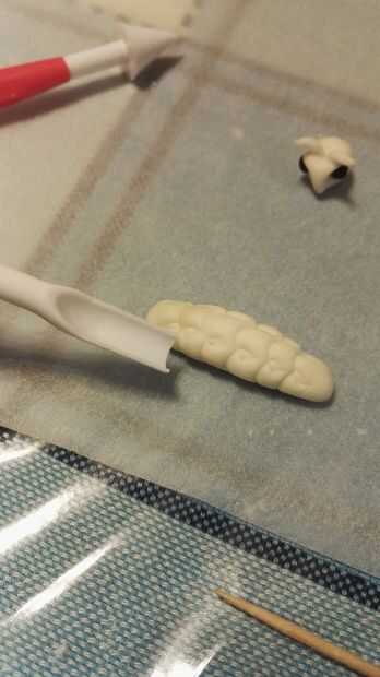 2. para los cuerpos de rodillo el fondant en un cilindro. Con la herramienta sculpting semicírculo añadir textura al cuerpo. Hacer 3 pequeños agujeros a cada lado para atar las patas.
