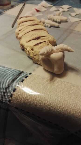 3. para las piernas, rodar pequeños cilindros de pastillaje (fondant) con los extremos puntiagudos y doblar en la forma deseada. Con pegamento comestible o agua se peguen al cuerpo. Hacer dos cilindros más puntiagudos para las antenas.
