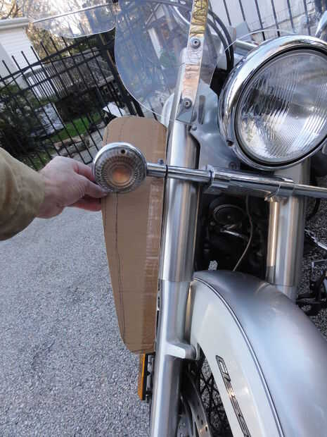 A continuación, corté en una forma que pensé que sería apropiado. Fue un poco más ancho en la parte superior (aproximadamente 4 3/4") que en la parte inferior (aproximadamente 2 1/2") y sostenido contra la horquilla para confirmar que era el perfil que quería. Comencé un poco largo pensando que yo podía siempre cortar más tarde.