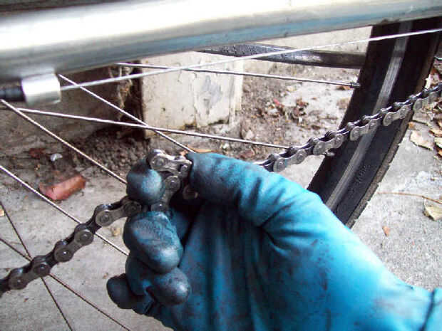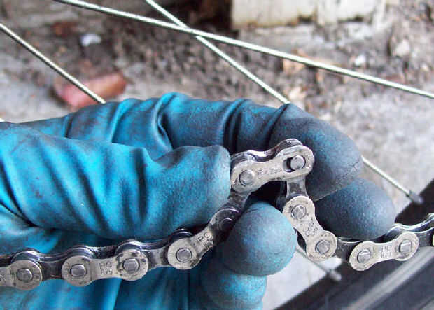 Antes de poder obtener el Powerlink para liberar, necesita obtener holgura en la cadena para que pueda trabajar con él. Usted probablemente sabía, también. En caso de que no es la manera estándar de holgura poner la cadena en el piñón más pequeño en la parte posterior y también el plato más pequeño en la parte delantera. Luego tira la cadena de engranajes frontal en conjunto por lo que cuelga en el marco. Si, como muchos de nosotros, va a limpiar los platos frontales, esto sería un buen momento para eliminarlos ya que te permite tirar de la cadena detrás del soporte inferior (esa cosa de montar el plato y los pedales en), cada vez más flojo. La idea es llegar lo suficientemente flojo como para que se puede aislar el Powerlink como se muestra en las fotos.