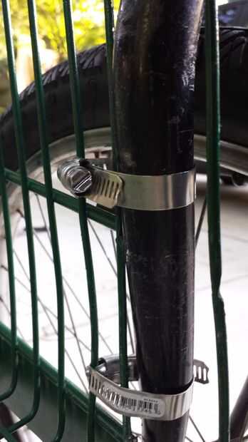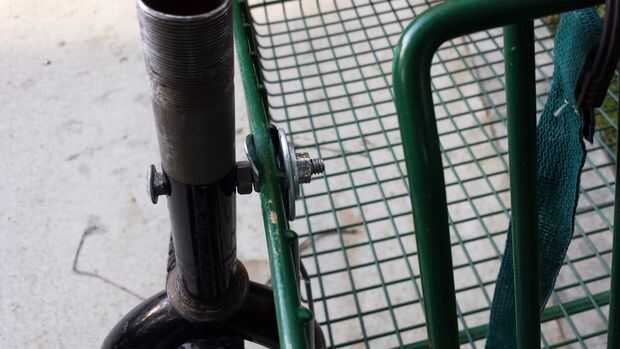 Usé la sierra para cortar las piernas en el carro mientras las tomas lo sostuvo para arriba. Corte parte de la caja del carro por lo que podría colocar las horquillas de las otras dos motos en el carro. Usé varios pernos, arandelas y abrazaderas de manguera más pequeñas para atarlos a la cesta. Al principio, se deslicen las horquillas y las ruedas serían moler contra el lado del carro. Por suerte, las puntas donde alguna vez fueron los frenos podrían utilizarse para empujar contra el carro, teniendo la rueda apenas lejos del carro.