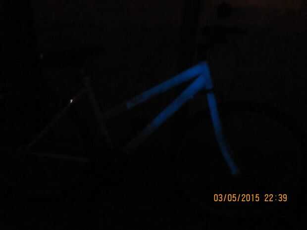 La pintura Plasti Dip resplandor debe cargarse en la luz antes de puede brillar intensamente. Aunque fue brillante brillantemente en tiempo real, no he podido conseguir una foto de ella con mi teléfono celular. Esta foto de la bicicleta que brilla en la oscuridad debía tomar con una cámara mayor.