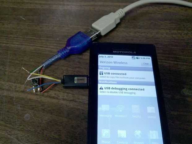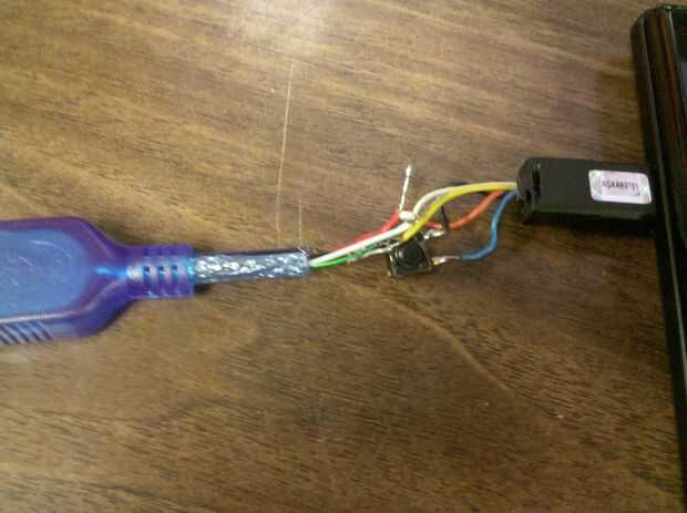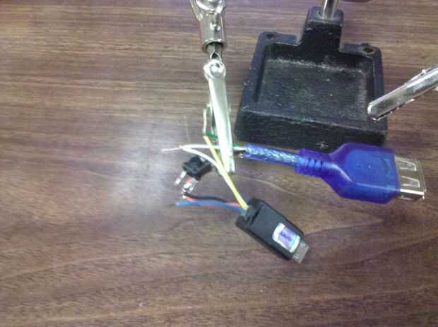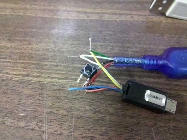 Si el cable MicroUSB tenía cinco alambres, por desgracia, continuar la soldadura será difícil. Por lo menos con mi conector, los colores no corresponden correctamente. Esto requerirá que conjetura y comprobación. Usando el adaptador en progreso, elija dos cables y enróllelos juntos. Asegurarse de que no corta con cualquier cosa! Enchufe en tu Droid y el otro extremo a un ordenador cercano (con A un cable) y trate de montar su droide en el equipo. Si lo monta, luego horray! Soldar los dos hilos juntos y el último con el restante conector del pulsador. De lo contrario, si no pasa nada, entonces Desconecte del ordenador y probar dos cables diferentes.