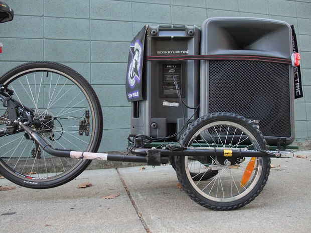 Esta configuración utiliza doble 12" PA altavoces. Una batería de 24V ocultos debajo de tablero mantiene el manejo estable. El diseño de remolque de cama plana es fácil de construir, ligero y durable. Integramos ~ 150W amperios dentro de cada altavoz, pero otras configuraciones de amplificador son posibles.