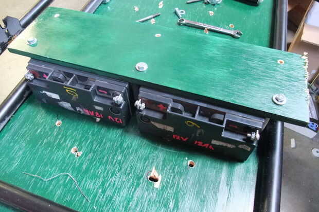 Utilicé tornillos de 1/4", aproximadamente 4" de largo. Pongo espaciadores de plástico alrededor de los pernos para proteger los lados de las pilas de la vibración. Una tira de goma también debería funcionar.