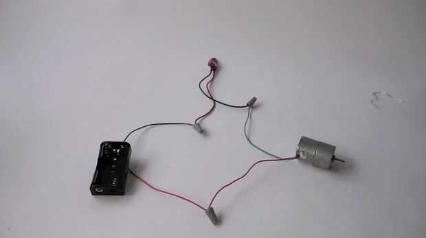 Las partes que sólo los cables pelados para son los principales elementos de este circuito: el motor, la batería y el interruptor. A Conecte los cables como sigue (esto es importante para girar el motor la forma correcta):