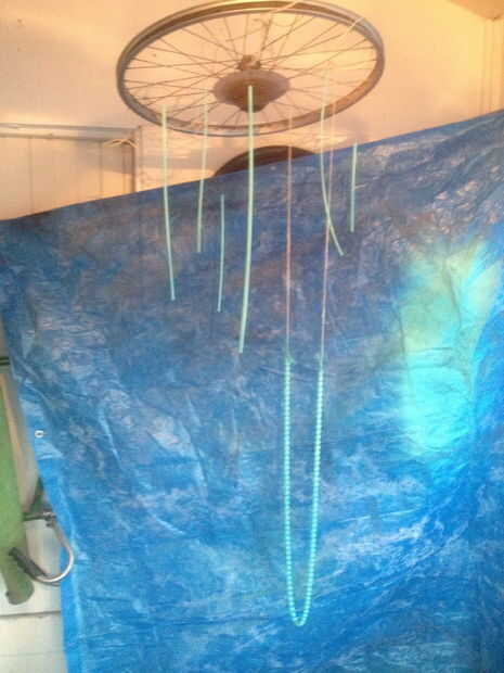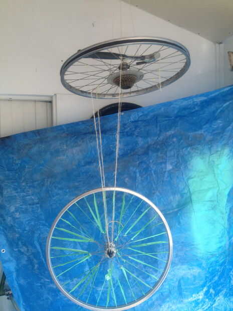 Para esto aparejado a una muy rápida y áspera 'móvil' para suspender lo que estaba trabajando en. Se hace literalmente de guita de Bailer (cuerda-como algo hará) y una rueda vieja que tenía en la sala de trabajo.