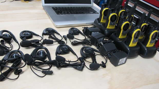 Cada par de pasajeros-piloto necesita un par de auriculares walkie talkies en el mismo canal. Walkie-talkie del pasajero puede ser zip atado a la estructura de la silla de ruedas, y el auricular se debe poner en bajo el equipo de seguridad.