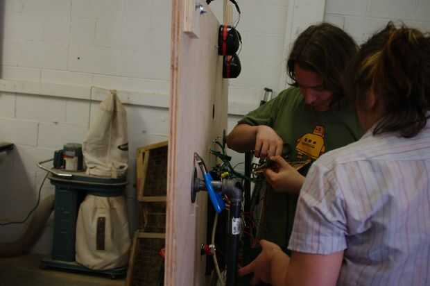 Atornille bridas para el centro de la base de puntales y la parte posterior de la Junta. Atornillar los componentes de tubería (bridas--> a los pezones de la Junta--> a codos--> a varillas largas--> a puntales de piso).