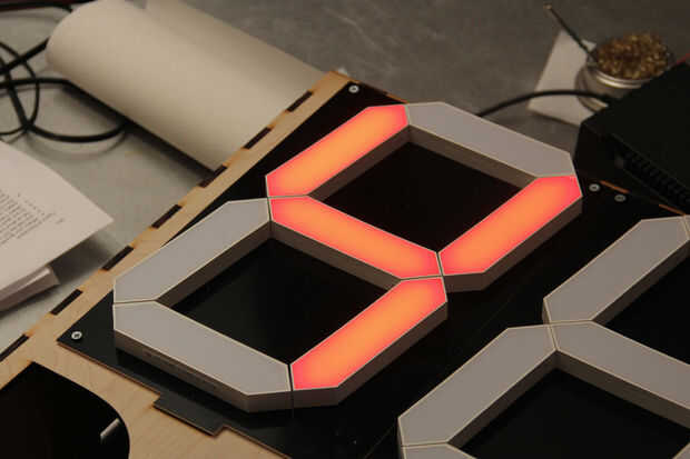 La muestra seg 7 fueron controlado por los pines A0-A5 y D0-D7 de la Arduino a través de un Darlington 2803 (a la fuente más actual). Cada seg de las pantallas gigantes 7-seg estaba formado por cuatro líneas paralelas de 15 LEDs rojos en serie. Va de una CA de 35V DC fuente de alimentación. Aparte de la corriente especial y consideraciones de la tensión, lo gigante 7-seg se controla como cualquier otra muestra común ánodo 7 seg.