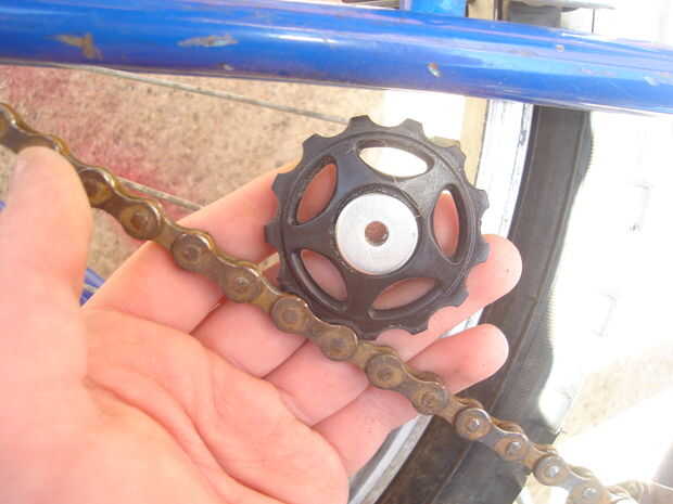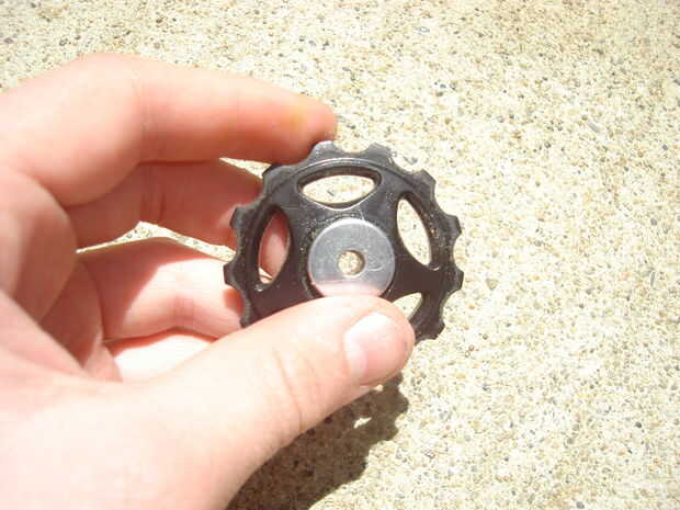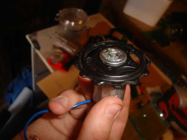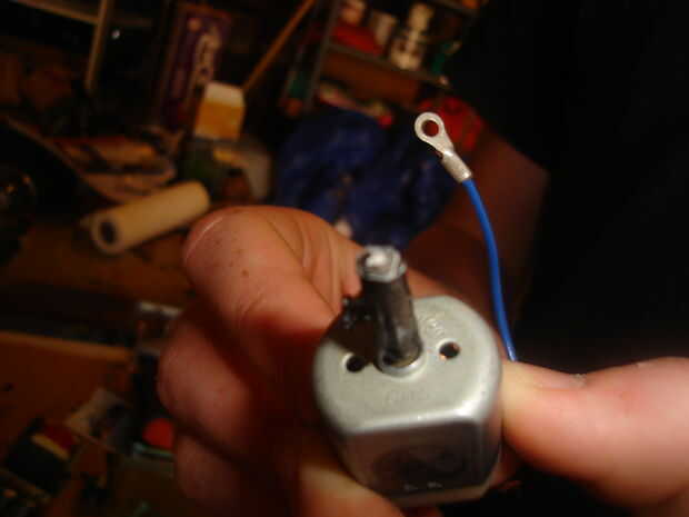 OK, ahora necesitas montar tu equipo en el motor. Nuestro árbol era poco demasiado pequeño para encajar en el engranaje, por lo que nos envuelve en alguna cinta. Luego utilizamos una cantidad abundante de pegamento caliente y unas arandelas para sujetar en su lugar.