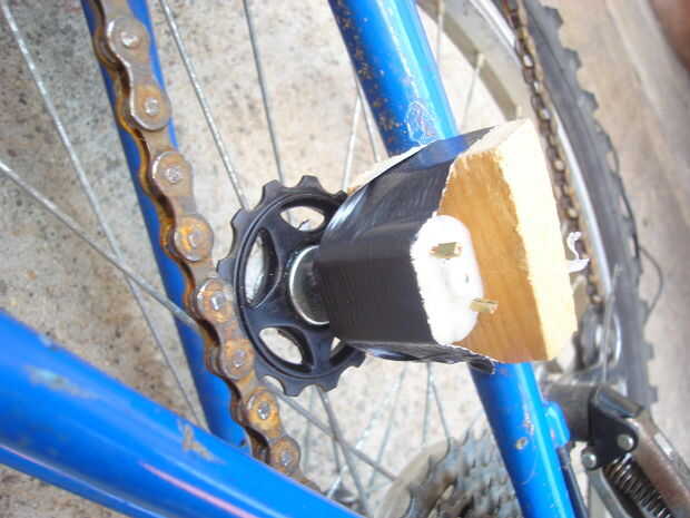Gee, que seguro estamos haciendo un montón de montaje hoy! OK, esta parte es fácil, que solo tienes que poner la configuración del motor en la bicicleta de manera que la cadena se captura en el engranaje y girar el motor. Es fácil hacerlo con pegamento caliente, zip lazos y cinta aislante.