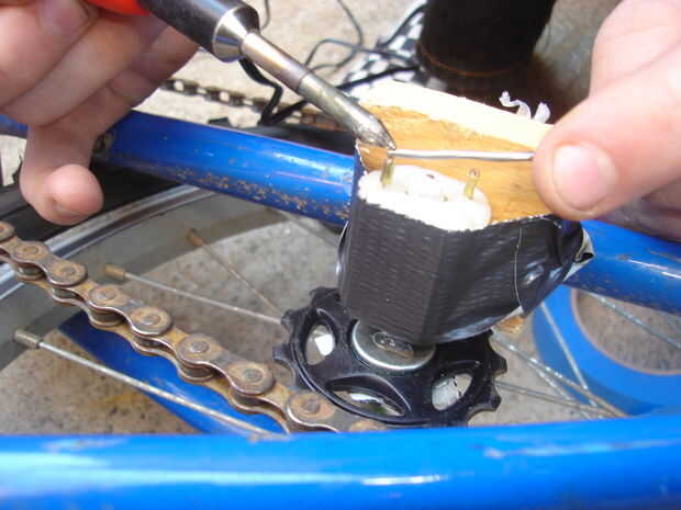 OK, ahora para la electrónica, a cortar la cabeza de su cargador y tira de los hilos de él y luego soldarlos al motor. Que tenga que usar algunas resistencias dependiendo de la tensión que toma su teléfono celular. También puede envolver el producto final en alguna cinta de color para que coincida con la moto como lo hicimos!